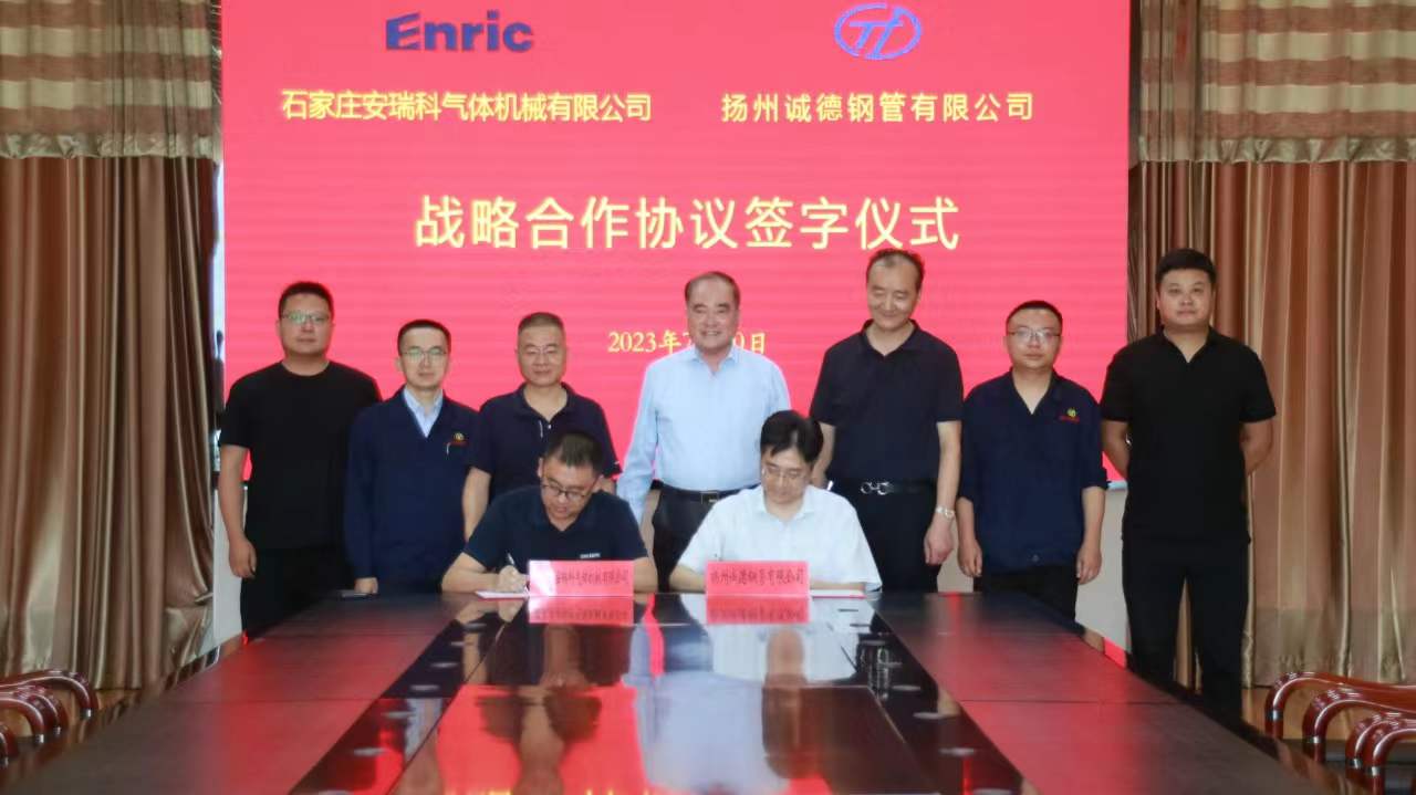 7月30日,揚州誠德鋼管有限公司總經理張錚先生,石家莊安瑞科氣體機械有限公司總經理張彪先生,于江蘇誠德鋼管集團紅樓會議室舉行會談,并代表雙方簽署戰略合作協議。揚州誠德鋼管有限公司董事長張懷德先生,石家莊安瑞科氣體機械有限公司采購部經理趙紅賓先生等相關人員共同參與并鑒證了簽約儀式。